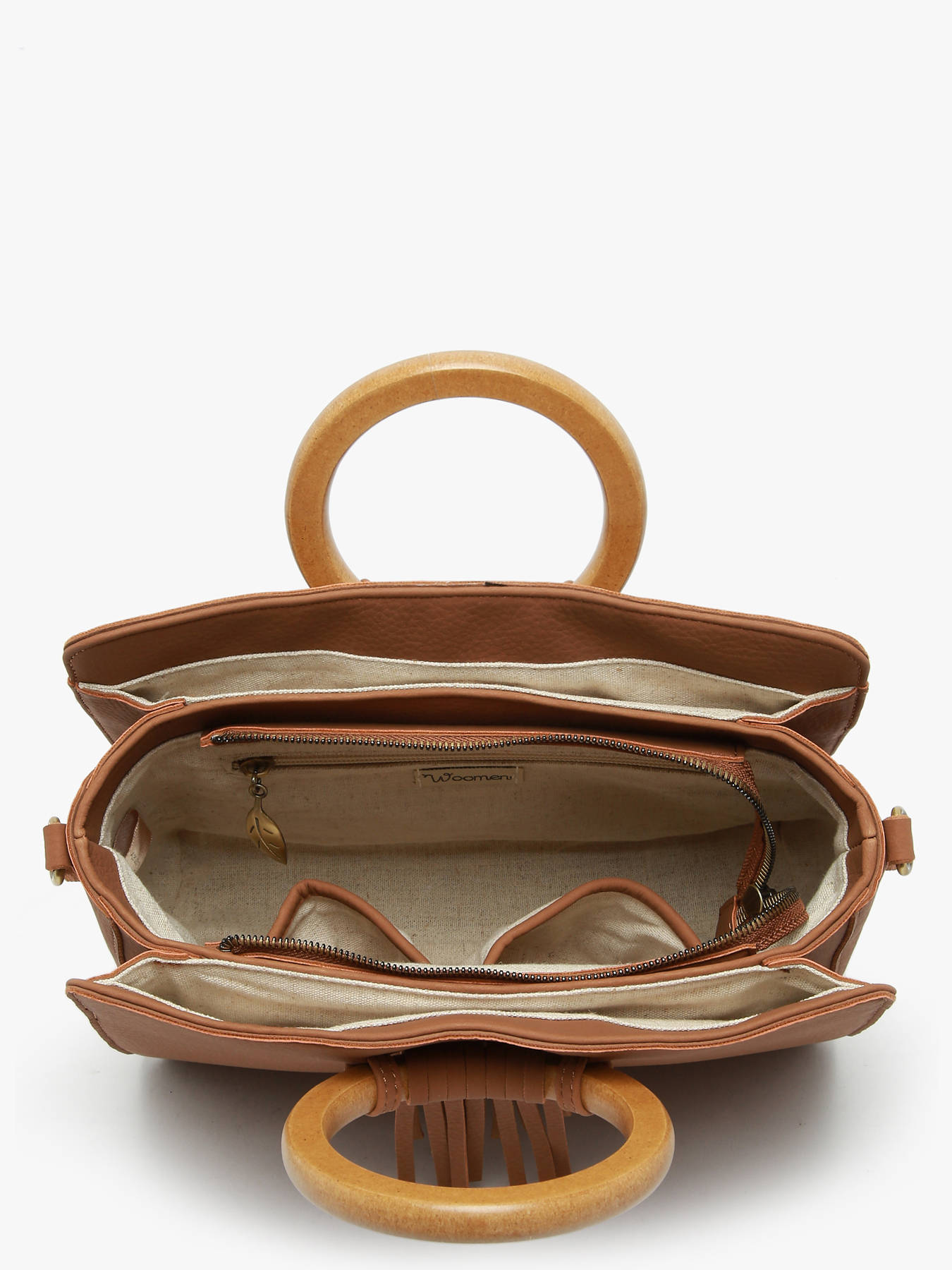 De WOOMEN handtas uit de CAMOMILLE-lijn charmeert met zijn ontwerp in gerecycled polyurethaan en een voering van katoen en linnen. Functioneel en elegant, hij beschikt over een hoofdvak met rits, verschillende zakken, een verstelbare en afneembare iriserende schouderriem, franjes, houten ringen en een ingebed logo. De tas toont ook een nieuw, onderscheidend logo, wat een moderne en verfijnde uitstraling geeft.